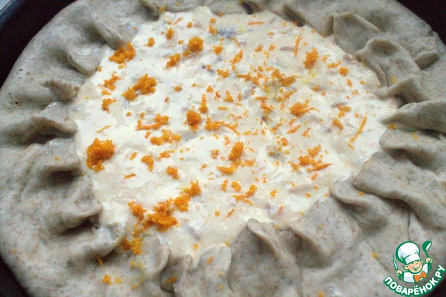 Начинку распределить ровным слоем до бортов и защипать тесто с краёв. Ещё немного цедры сверху.