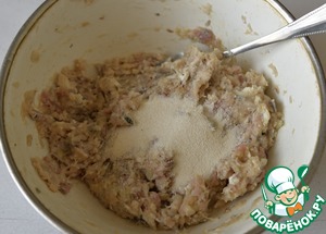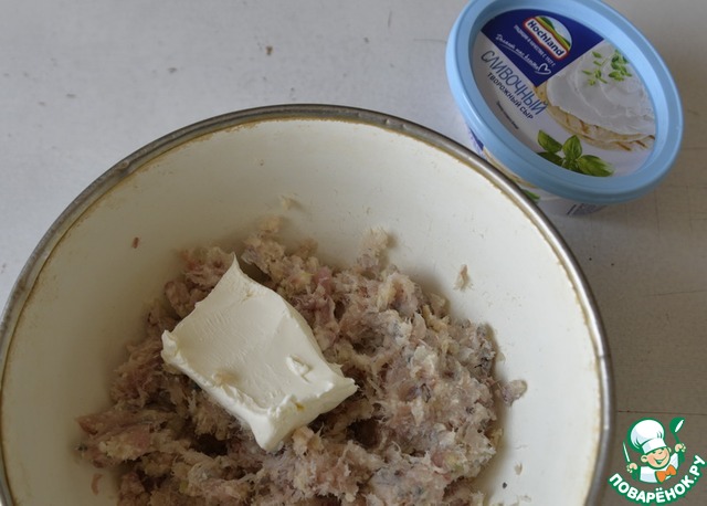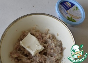 Добавляем к фаршу творожный сыр, у меня Hochland, хорошо перемешиваем.