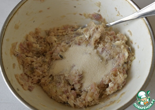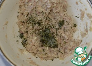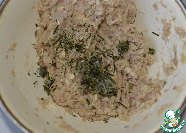 Кладём яйцо, соль, смесь перцев, кориандр, рубленный укроп, перемешиваем. Фарш должен быть нежным и воздушным, если слишком жидкий, то добавьте ещё манной крупы, но не кладите много.