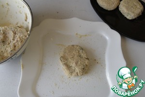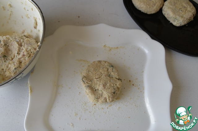Форму смазываем маслом. Из фарша делаем круглые котлетки, обваливаем их в панировочных сухарях. Кладём в форму. Я делала половину количества. Из полной нормы получится около 10 штук.
