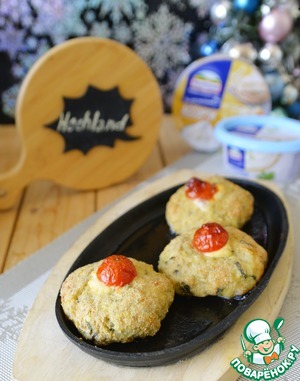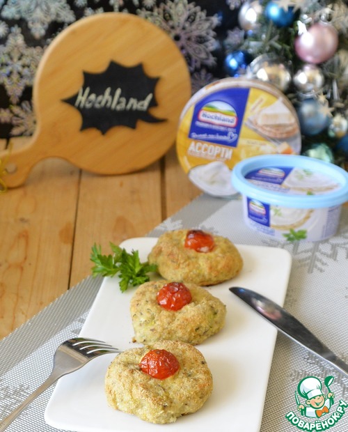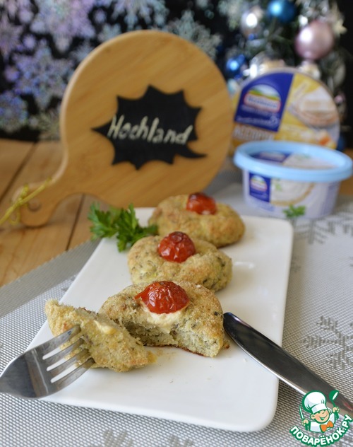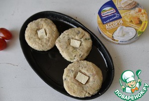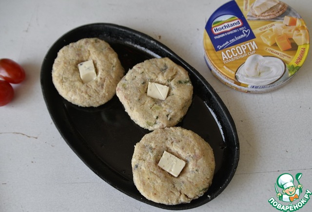 В каждой котлете посредине делаем небольшое углубление и кладём кусочек плавленного сыра, у меня Hochland в треугольниках "Ассорти", я выбрала с грибами.