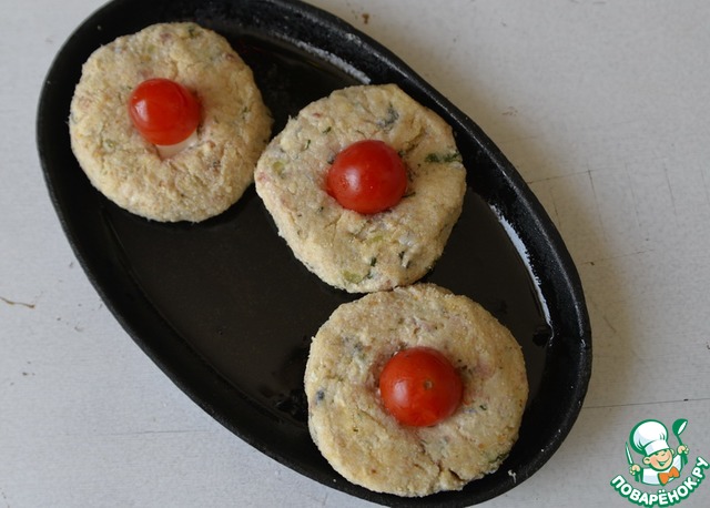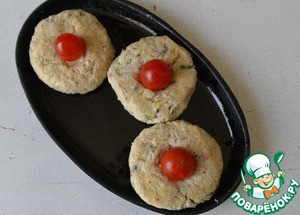 Помидорки черри режем пополам и кладём сверху сыра. Ставим в духовку на 180 градусов на 30-40 минут.