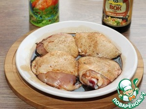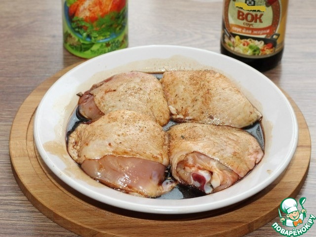 1. Взбиваем венчиком яичный белок и смешиваем с молотой приправой для курицы (0,5 ч. л.) и с соусом для жарки ВОК. Пробуем на соль. Заливаем курицу смесью и перемешиваем, закрываем крышкой и оставляем мариноваться, минут на 30-60.