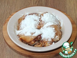 2. Удаляем лишнюю жидкость с курицы, я положила в дуршлаг. Перекладываем в миску и засыпаем картофельным крахмалом, 1-1,5 ст. л. Перемешиваем.