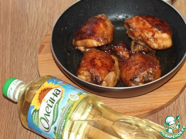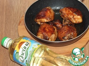 3. Разогреваем подсолнечное масло (3-4 ст. л.) и жарим курицу на сильном огне с двух сторон до хорошей и красивой корочки, но не до готовности. Выкладываем курочку из сковороды. Масло очищаем через сито и добавляем свежее.