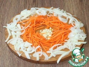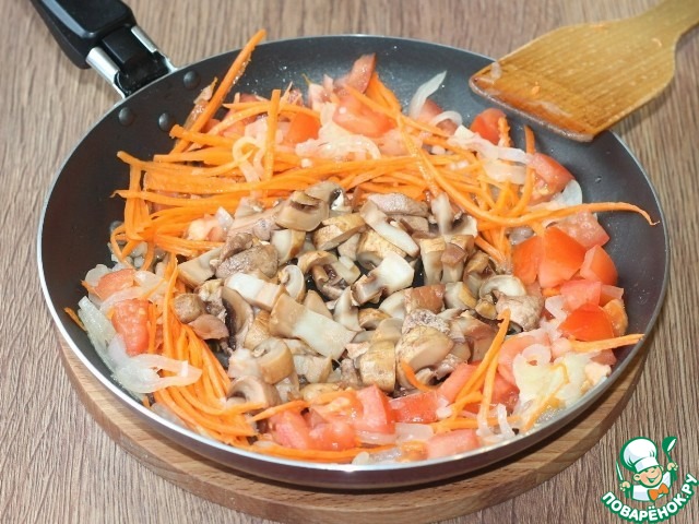 5. На разогретом подсолнечном масле обжариваем лук, через 2-3 минуты кладем чеснок, готовим до появления чесночного аромата (1 мин.). Затем добавляем морковь и через 2-3 минуты помидор, тушим минуты 3.