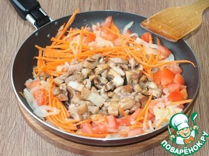 4. Приготовим зажарку. Нарезаем очищенные овощи: лук нарезаем полукольцами, морковь соломкой, помидор кубиками и мелко рубим чеснок. Дольками нарезаем грибы.