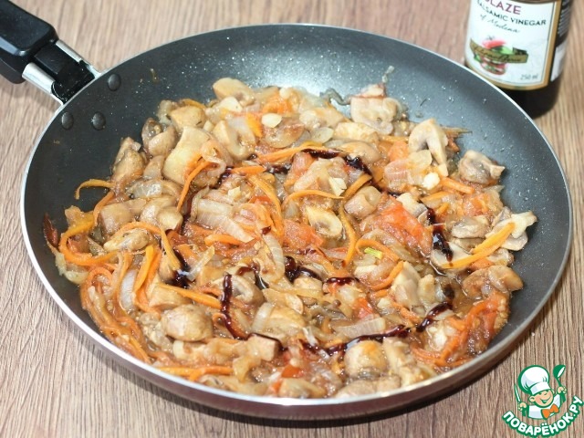 6. В зажарку кладем грибы, добавляем оставшийся маринад, бальзамик, приправу (0,5 ч. л.), перец и соль, перемешиваем и тушим под крышкой до готовности грибов.