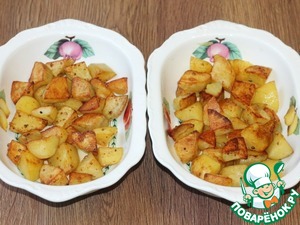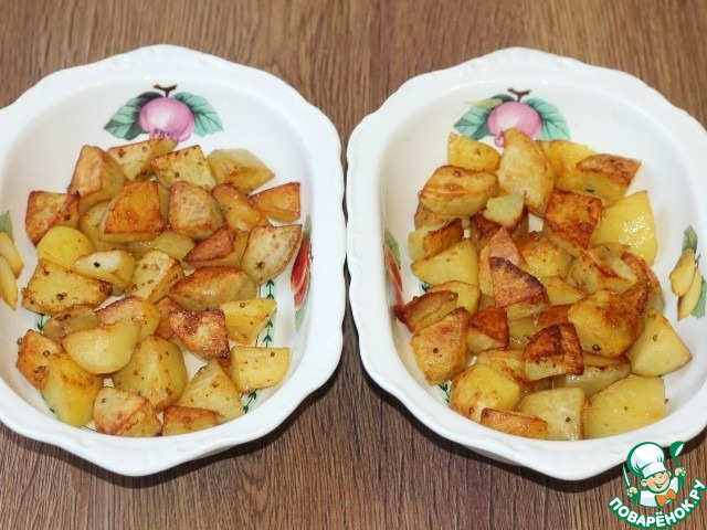 8. Очищенный картофель нарезаем дольками и смешиваем с молотой приправой (0,5 ч. л., зира и кориандр), солим и перчим, зажариваем до румяной корочки и до полуготовности.