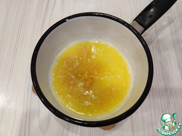 Растопить сливочное масло (50 г.), добавить в масло 1 ст. ложку апельсиновой цедры и 40 мл. апельсинового сока. Смесь размешать.