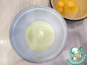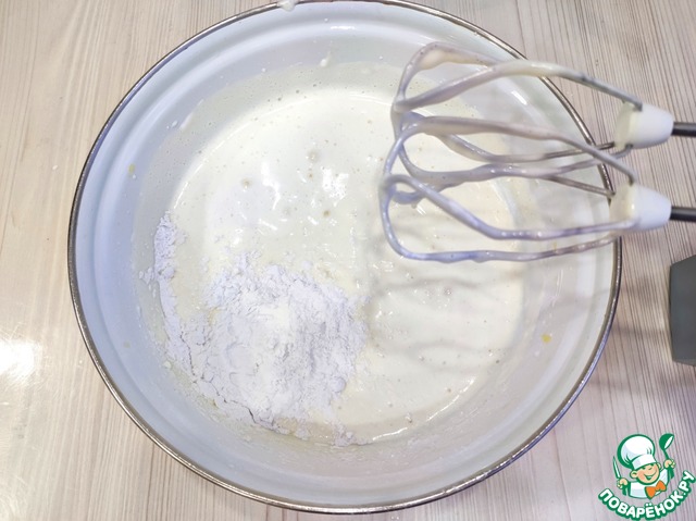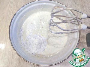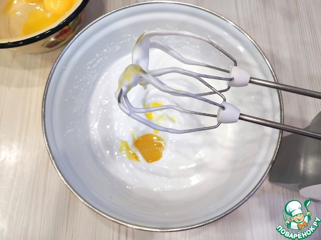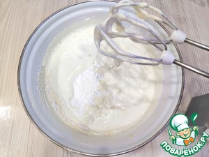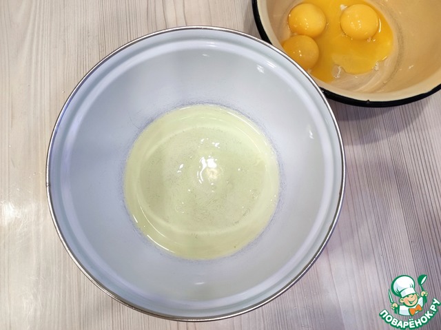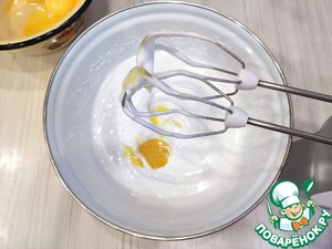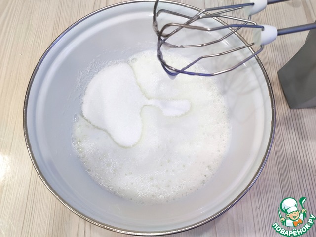 Взбить белки в легкую пену, затем не прекращая взбивать добавить 120 г. сахара и 1 ч. ложку лимонного сока.