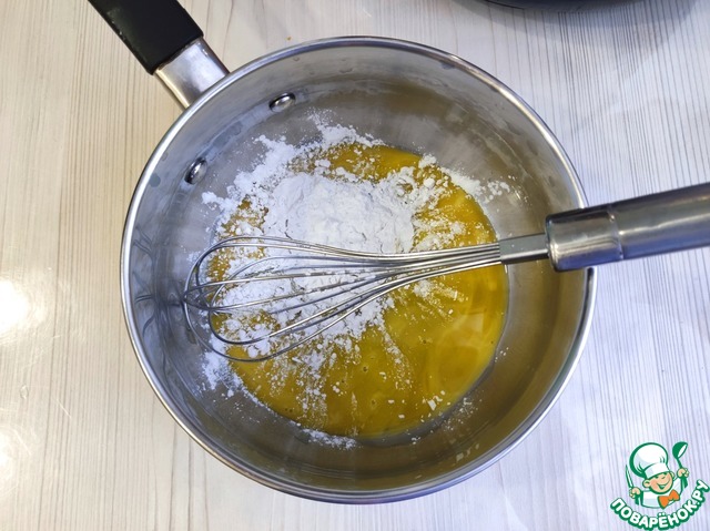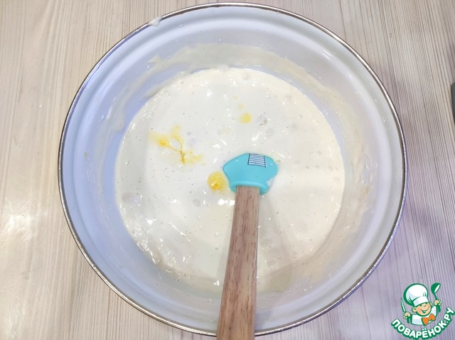 Жидкое тесто аккуратно вымешать снизу вверх. Затем добавить смесь растопленного сливочного масла и апельсинового сока.