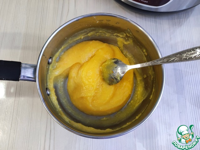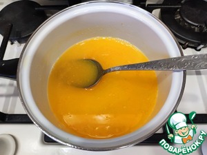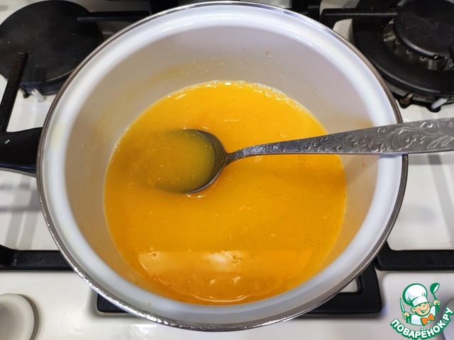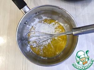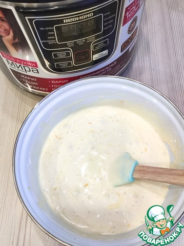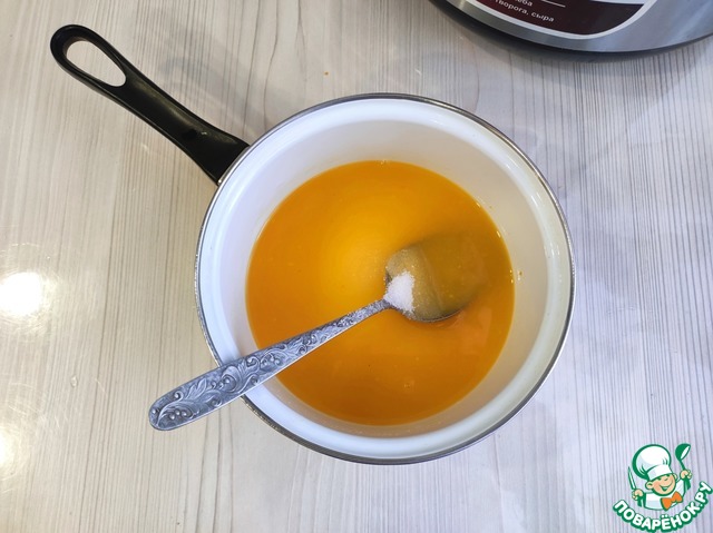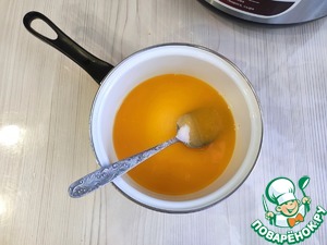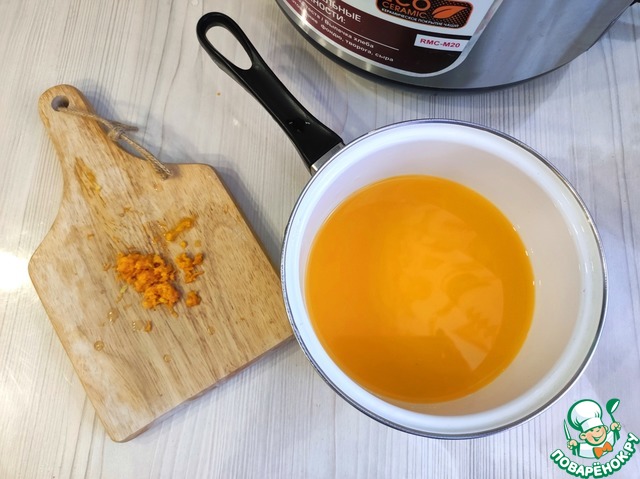 Для крема: Добавить в емкость 150 мл. апельсинового сока, добавить 1 ч. ложку апельсиновой цедры и 60 гр. сахара.