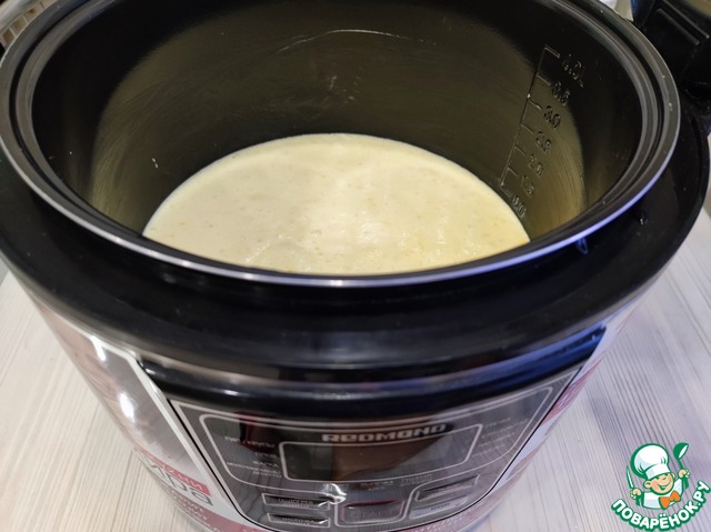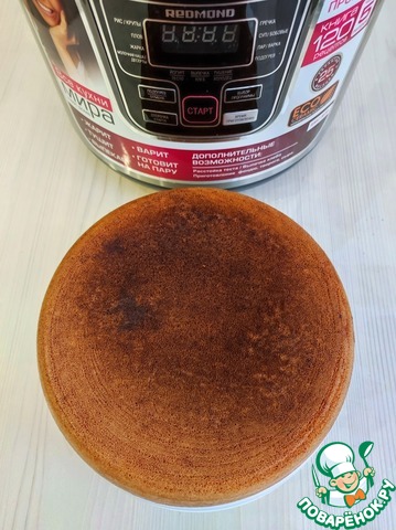 Чашу мультиварки ТМ "REDMOND" смазать тонким слоем сливочного масла. Добавить в чашу мультиварки подготовленное для выпекания бисквитное тесто. Выпекать бисквитный корж в режиме "Выпечка/хлеб".