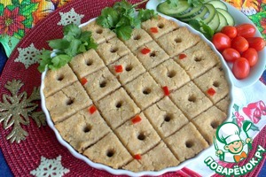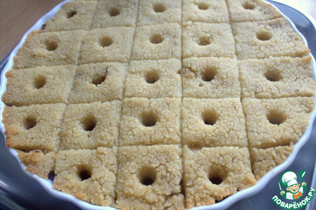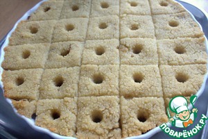 Накрыть оставшейся крупой, надрезать и сделать ямки с помощью деревянной ложки.