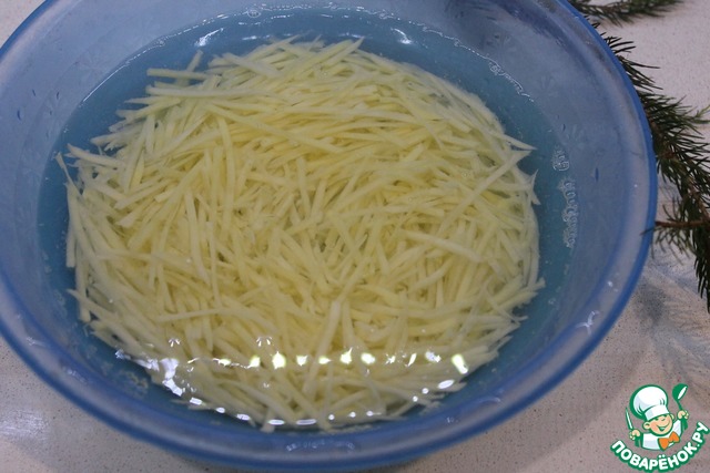 Очищенный картофель натереть на тёрке для моркови по-корейски. Затем его нужно несколько раз промыть до прозрачной воды, чтобы вымылся весь крахмал. В кастрюле вскипятить воду, посолить её влить 3 столовый ложки уксуса. В кипящую воду опустить промытый картофель, довести до кипения и проварить 1-2 минутки. Важно: картошка не должна стать мягкой и развариться.
