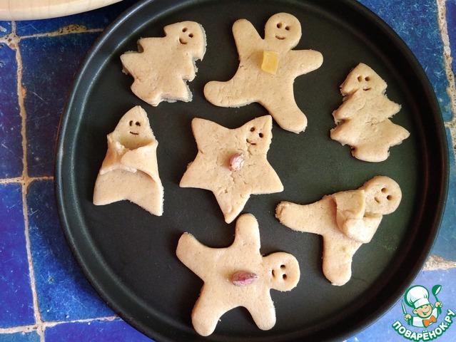 Выкладываем печенье на силиконовый коврик или на пекарскую бумагу на протвине. Я использую форму для пиццы антипригарную D-26 см. Из этого количества теста я сформировала 15 шт печений. Деревянной шпажкой сделала глазки, ротики... На одной партии печений "в руки дала" орешки и цукаты. Выпекала в 2 раза. У меня эл шкаф на 18 л. Форма D-26 см встаёт только-только. Печенье ставим в разогретую духовку до т-180 С примерно на 7-10 минут. Не пересушивайте! Ориентируйтесь на свою духовку.