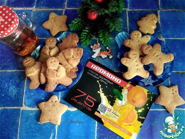 Новогоднее печенье с ароматом корицы с яблочным вкусом. Сок для печенья делала сама при помощи соковыжималки. Он получается очень концентрированным. В выпечку такого сока нужно совсем немного.