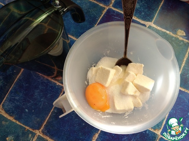 Масло нужно заранее вынуть из холодильника, чтобы оно было мягкое. Нарезаем его кусочками. У яйца нужно отделить белок от желтка. Нам нужен только желток. Выкладываем сахар.