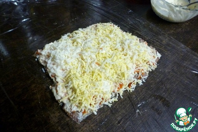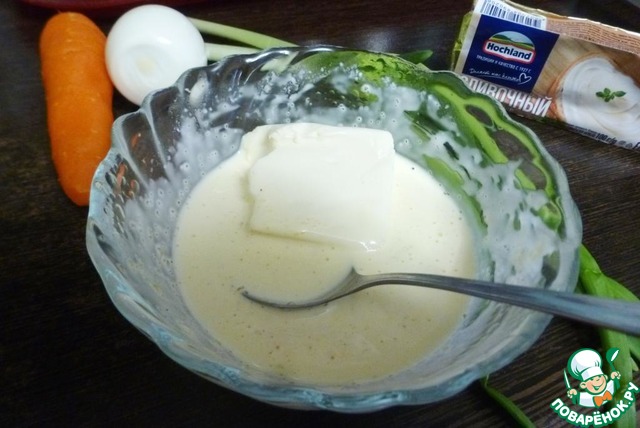 Приготовить сырный майонез для промазывания слоёв с добавлением желатина. Желатин я добавляю, чтобы слои не расползались и рулет остался кругленьким.