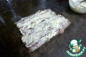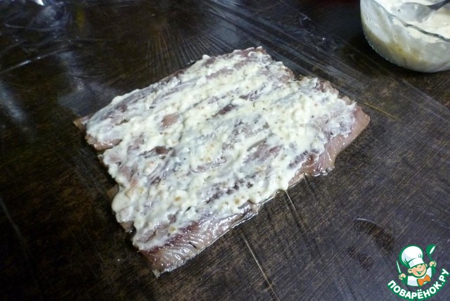 На пищевую пленку выложить в форме прямоугольника филе иваси и слегка смазать майонезной массой.