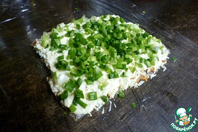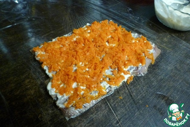 Второй слой - натертая варёная морковь и немного майонезной массы.