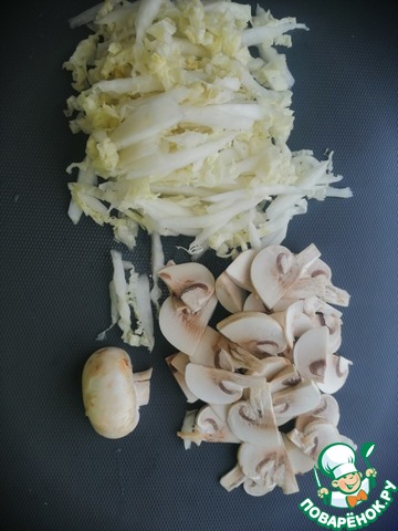 Капусту нашинковать, каждый гриб разрезать пополам, половинки - на тонкие пластинки.