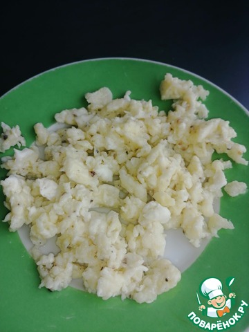 Разогреть раст. масло "Олейна" и приготовить быстро яичницу-болтунью. До зажаристости не доводить! После приготовления сразу переложить из сковороды в др. емкость, чтобы остановить дальнейший нагрев продукта.