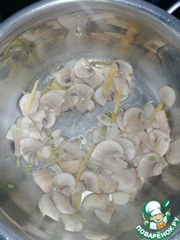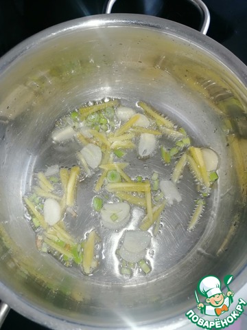 В кастрьле разогреть раст. масло "Олейна", положить нарезанную белую чсть зеленого лука, притушить слега, затем добавить чеснок и имбирь.