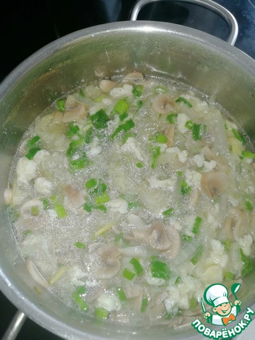 Затем добавить фунчозу, варить после закипания пару минут, после - яйцо и зеленый лук - еще минуту. -
