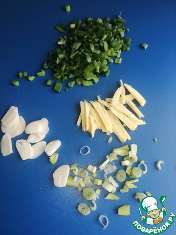 Чеснок нарезать тонкими пластинками, имбирь - соломкой, лук - мелкими кусочками.