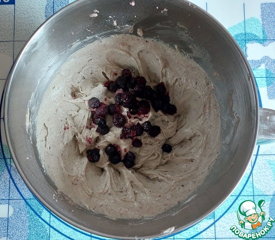Муку смешать с крахмалом и разрыхлителем, просеять и добавить к взбитому. Вымесить до однородности и добавить чернику, я воспользовалась силиконовой лопаткой. Тесто консистенции густой сметаны, может быть, придётся добавить ещё немного муки. Ягоды можно и не добавлять или добавить изюм на ваше усмотрение.