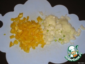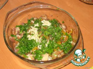 В горячее куриное филе добавляем перец с луком (обжаренные), мелко нарезанную зелень и чеснок.