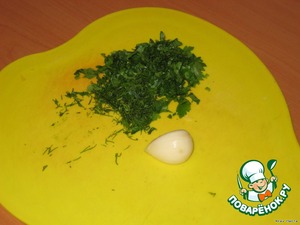 Зелень мелко режем, чеснок на чеснокодавилку.