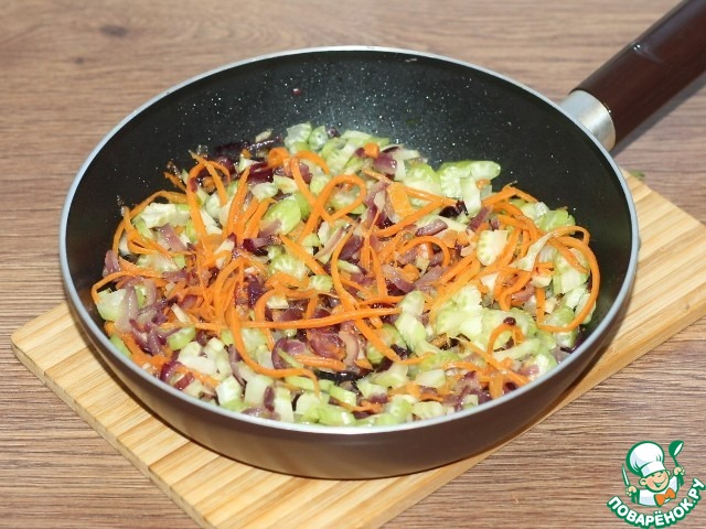 9. На разогретом растительном масле обжариваем лук, 2-3 минуты. Добавляем чеснок, жарим до появления аромата, 1-2 минуты. Кладем морковь и пассеруем минуты 3. Затем добавляем сливочное масло и сельдерей (стебель).