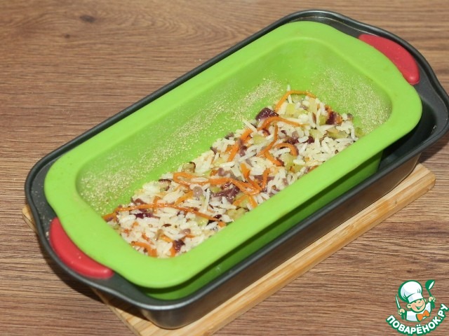 13. Подготовим формочку (14*9 см) для выпечки. Смазываем формочку растительным маслом и посыпаем панировочными сухарями. Выкладываем 1/3 часть теста.