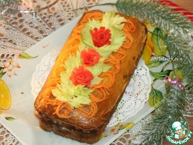 Перед подачей пирог украшаем. Я украсила маринованными овощами: морковью и имбирем. Приятного аппетита!