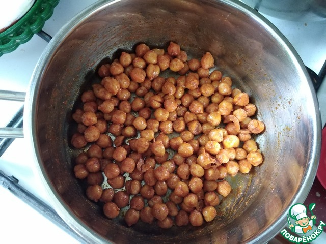 Время приготовления салата без отваривания нута. Это нужно сделать заранее или сейчас продают нут в консервированных банках в с/с. Я нут отварила. На ночь замочила, утром промыла, залила свежей водой и отварила 1 час, не соля. Откинула на дуршлаг и дала жидкости стечь. Её я всегда сохраняю для супов. В сотейник налила оливкового масла, выложила специи: куркуму, перец кайен и паприку копчёную. Прогрела, чтобы масло объединилось со специями и выложила нут. Немного обжарила его, чтобы нут пропитался всеми специями, посолила. Острота салата будет зависеть от перца кайен. Кладите его по вкусу. Можно его заменить на красный жгучий перец.
