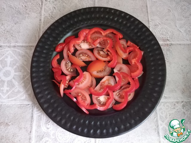 Берём сразу для подачи салата красивое блюдо. Режем помидор не мелко. Я порезала 2 небольшие помидорины вначале пополам, а затем каждую половинку тонкими слайсами. Выложила помидоры на низ блюда. Далее - болгарский перец. Половину болгарского перца порезала тонкими длинными полосками. выложила на помидоры.