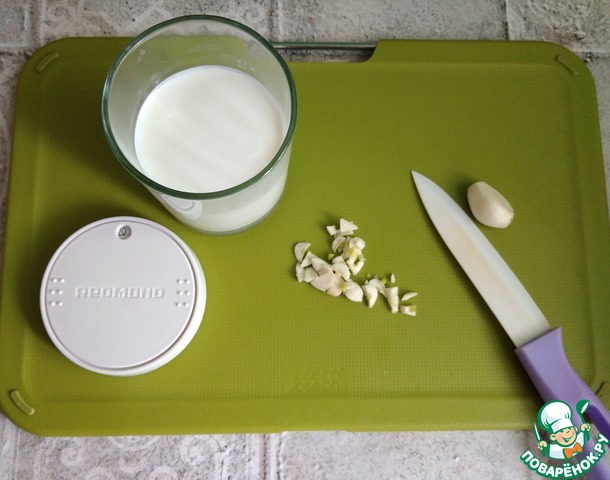 Сегодня из такого йогурта я буду делать заправку к салату. В 130 г йогурта добавлю 2 зубчика чеснока мелко порезанного, можно его выдавить через пресс. Чеснок кладите по вкусу.