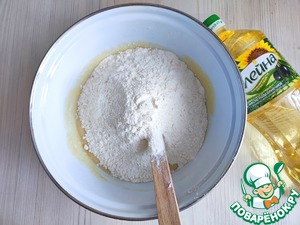 Затем добавить яйцо (1 шт.), добавить подсолнечное масло ТМ "Олейна" (50 мл.). Смесь хорошо вымешать до полного растворения сахара.