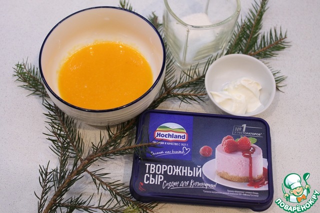 Пока кексы запекаются сделать начинку. Для этого 70 грамм мандаринового пюре, густые сливки (или мягкое сливочное масло), творожный сыр, сахар и кукурузный крахмал соединить в пиале и хорошо перемешать.