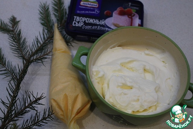 Для крема сверху смешать густые сливки (или сливочное масло), творожный сыр и сахар. Взбить.