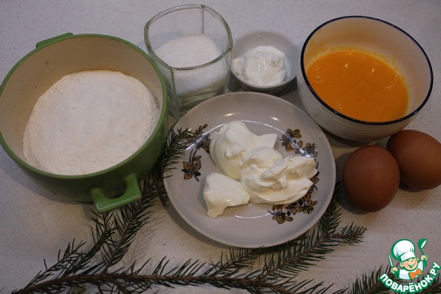Для теста и начинки нужно подготовить мандариновое пюре. Для этого мандарины почистить и пробить блендером. Затем протереть через сито. Сахар взбить с густыми сливками или маслом, по одному добавить яйца. Хорошо взбить. Влить пюре (90 грамм) и сметану. Перемешать. Добавить просеянную муку с разрыхлителем, перемешать миксером.