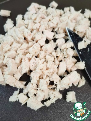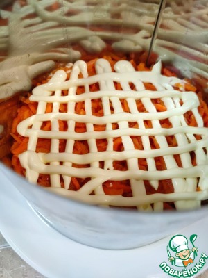 Соберите салат. Подачу можно выбрать любую - порционную, в салатнике и т. д. Я собирала в кольце (d - 14). Кольцо поставьте на плоскую тарелку, в которой будете подавать салат. На дно тарелки выдавите немного майонеза, распределите по диаметру кольца. Затем выложите слой куриного филе, слегка его утрамбуйте. Следующий слой сетка из майонеза.