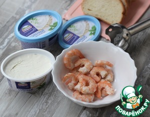 Закуска просто изумительная, её можно приготовить заранее и хранить в холодильнике 2-3 дня. Для её приготовления понадобится багет или тостовый хлеб, вареные креветки и творожный сыр Hochland.