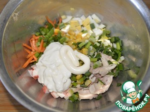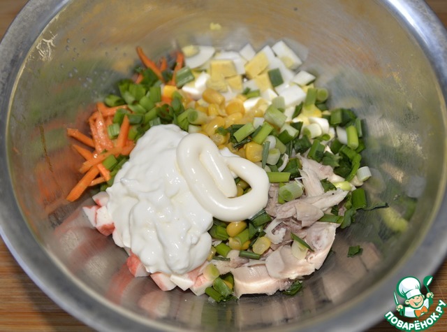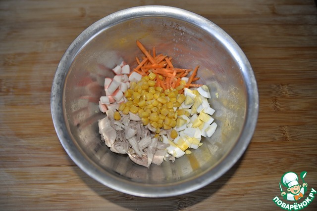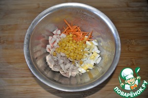 Заранее отвариваем курицу, у меня голень, она нежнее грудки, это на ваше усмотрение. Режем куриное филе полосками или кубиками. Также режем варёные яйца, крабовые палочки. Кладём к моркови, добавляем кукурузу.