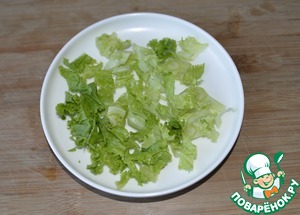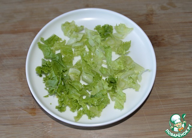Листья салата моем, обсушиваем, рвём или режем, кладём на блюдо.