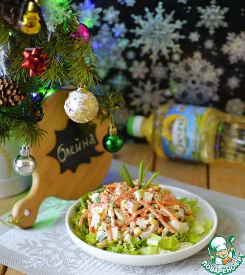 Идею этого салата увидела в интернете, отсюда и название. Салатов много не бывает на Новогоднем столе. Мне понравилось это вкусовое сочетание.