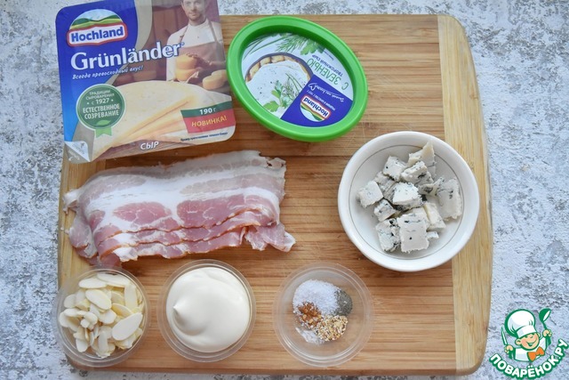 Этот сырный дип соус я подсмотрела у кулинарного блогера Ри Драммонд. Немного адаптировала рецепт под себя и в итоге получилась интересная на вкус, не требующая много времени на приготовление закуска. Богатый вкус, разнообразие текстур: хрустящий миндаль, соленый бекон, нежный творожный сыр, пикантный сыр с голубой плесенью, делает закуску по настоящему праздничной.